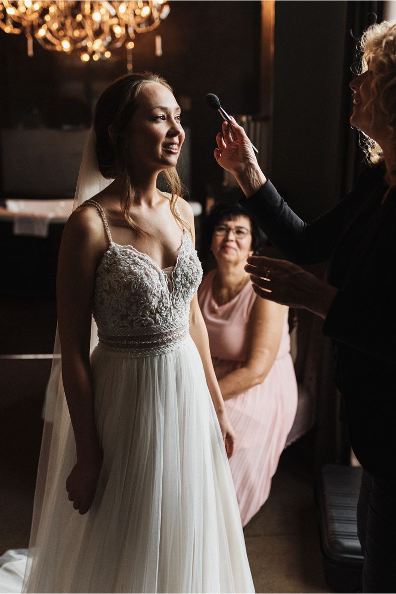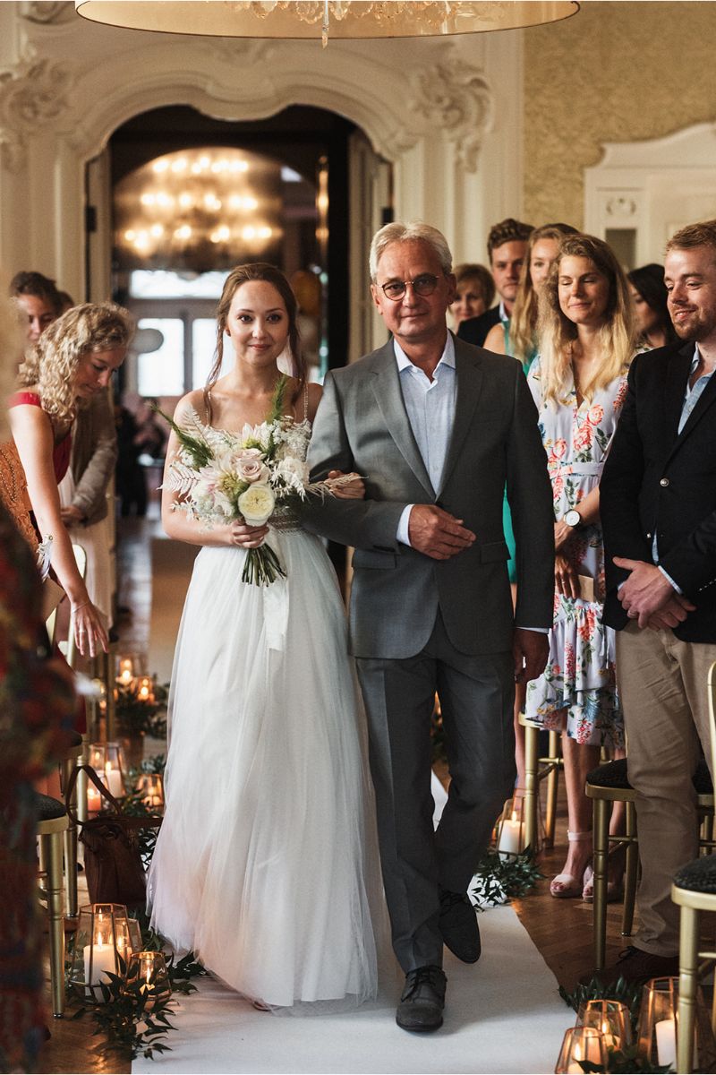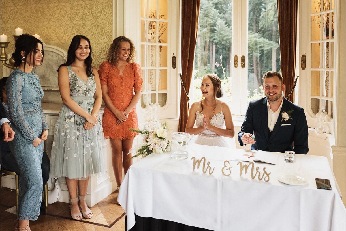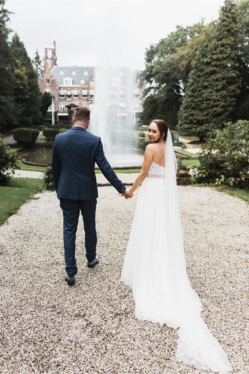 Een klassieke invulling van de dag, waarbij de first-look plaatsvond ten overstaan van alle gasten. Gevolgd door de ceremonie, liefdevolle geloftes en het ja-woord! Na een heerlijke taart met champagne was het tijd voor wat foto’s in en rondom het prachtige kasteel. Gelukkig was het even droog en dit leverde geweldige plaatjes op! En hoe fijn als je na een diner en borrel lekker je bedje in kan kruipen op de verdieping erboven?