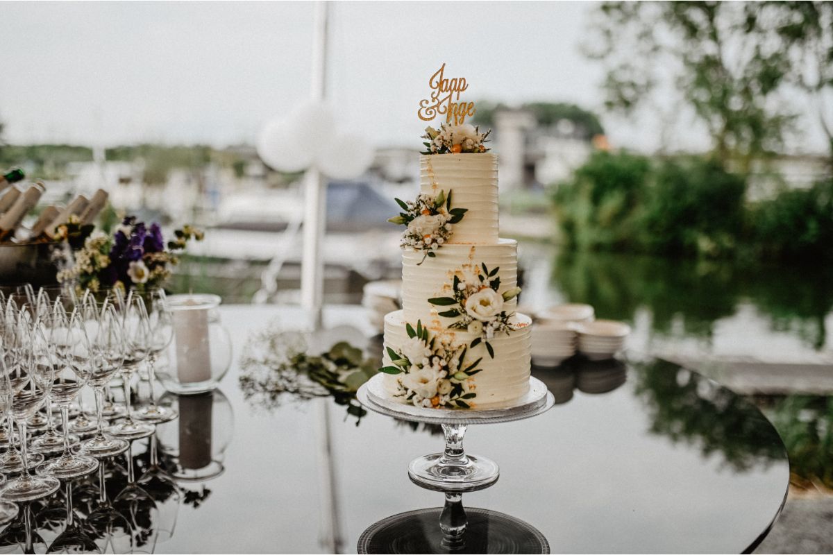 Maar de mooie dag begon op een boot! Varend door de grachten, even stoppen voor een lunch en toen aangemeerd bij de prachtige trouwlocatie. Na een spectaculaire ceremonie met livemuziek vond een borrel plaats met een heerlijke salsaband én taart. Maar er was meer: een uitgebreid zesgangendiner onderbroken door geweldige speeches, optredens en zelfs een stand-up comedian. Al met al een zeer geslaagde dag.